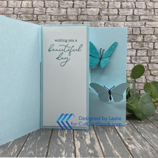 Here are shots of the card opening and then fully opened revealing a couple more butterflies that actually look like they are flittering out of the card. The inside sentiment is from the Altenew Enchanted Roses stamp set. Be sure to see my tutorial on the CutCardStock blog for more details on how to make this card!