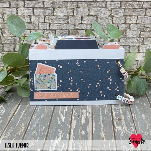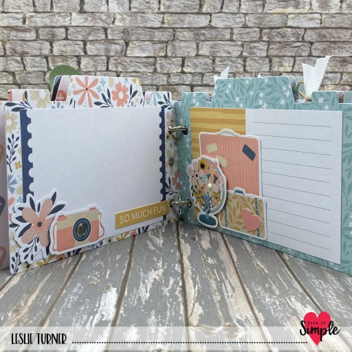 I cut the card base from CutCardStock Twine cardstock and layered a pretty floral print from this month’s collection on the front along with a slightly smaller layered piece in the center featuring square blocks (punched with the EK Success 1″ square punch) for the sentiment. I added chipboard letters from Rosie’s Studio Frolic Chipboard Alphabet in the upgrades along with floral stickers from the sticker sheet which I tucked under the corners of the blocks. The finishing touch on the front was adding a chipboard sentiment from Rosie’s Studio Frolic Chipboard Embellishments in the upgrades.
