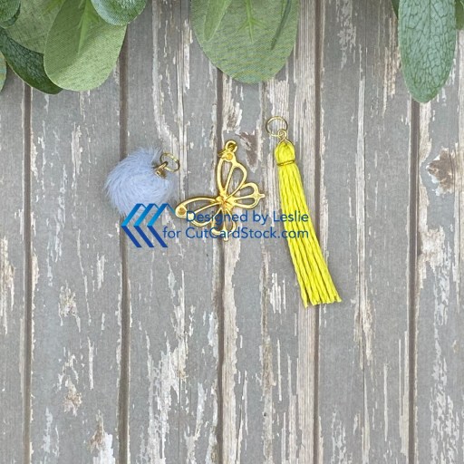 The first order of business was to add jump rings to the pom-pom and butterfly charm. I made the tassel from yellow hemp cord in my stash, and added a ring to that as well.