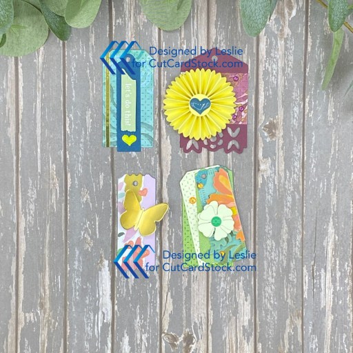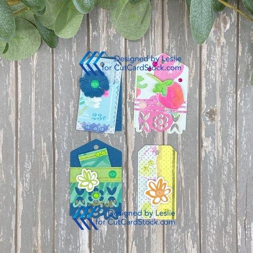 And here are the other four tags. I cut more pieces than I needed and was able to make eight additional tags for another mini tag flip, plus I have lots of extra die cuts to make more tag embellishments for future projects. Win-win!