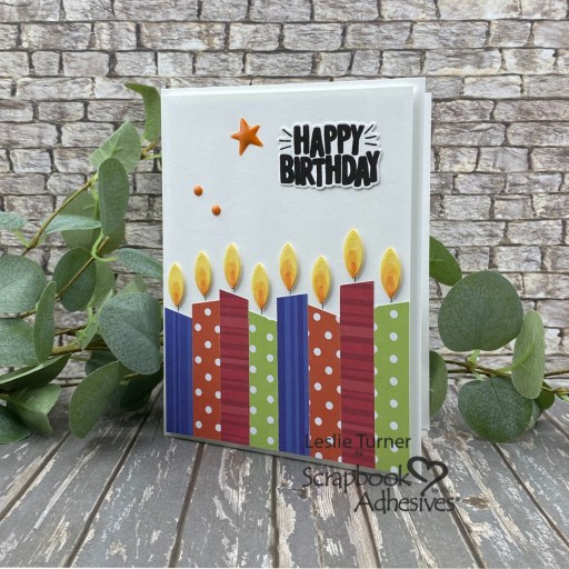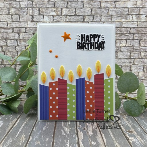 Hey everybody – I hope you’re having a great week! I’m up on the Scrapbook Adhesives By 3L blog today sharing a tutorial for making a super cute birthday candle card. I’ve made a few of these in the past (inspiration for the faux quilt design from Splitcoast Stampers HERE) but I made this one a little different. I used an older paper pack in my stash as well as die cut pieces and stamps/dies from the Happy Birthday collection at Keep It Simple. And, of course, I used some of the most awesome adhesives ever made to put it together!