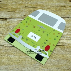 I cut these pieces on my Scan N Cut at the same time as the pieces for the other classic car card, using a heavy light green cardstock for the base, medium green for the van body and rear elements, gray for the windows, red for the lights, black for the tires, and metallic silver for the bumper. And once again, I found the perfect stamp set to use for the sentiment on the license plate and the inside sentiment!