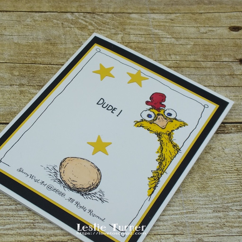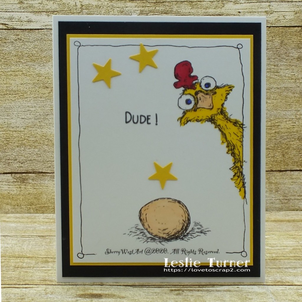 Hi everyone! Happy Monday! Hubby had a doctor appointment this morning and then we ran a few errands, so we are just now getting home. Affiliate links are used in this post at no cost to you. I really appreciate your support! I have a fun CAS card to share that I made yesterday for The Outlawz Sunday Songs & Rhymes Challenge. ‘Twinkle Twinkle Little Star’ is the rhyme for the new challenge that started yesterday so let me introduce to you my star struck chicken! This image is from Sherry West Art who is our sponsor this time! I did LOL (literally) a few times while making this card! I don’t even know the name of this image – it was a freebie in Sherry’s Facebook Group – but isn’t it a hoot?!