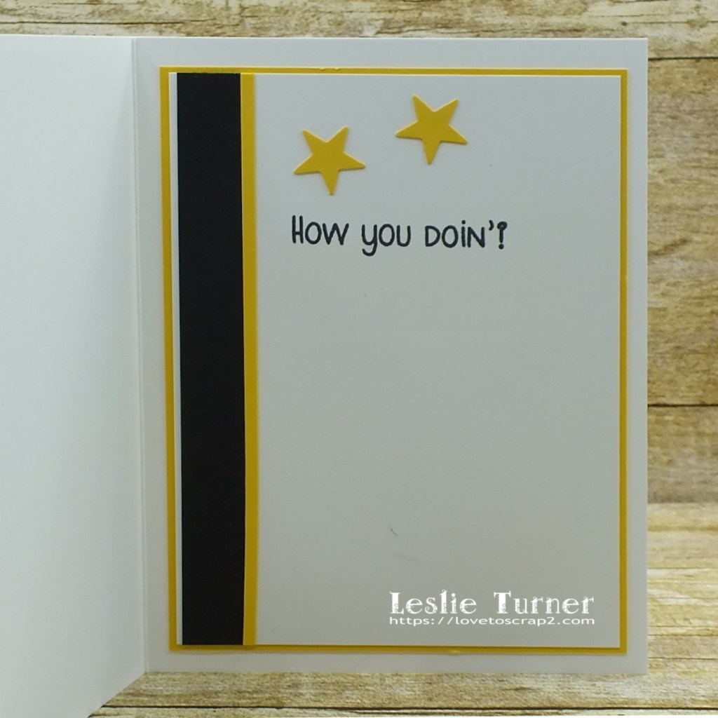 I cut the inside panel from Neenah Classic Crest Solar White cardstock and embellished it with strips of black and yellow cardstock, stamped the sentiment and layered the panel on yellow cardstock.