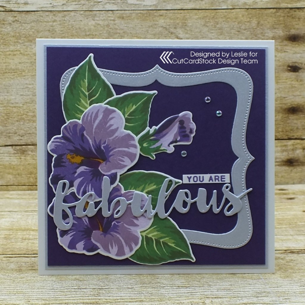 This card base is 5″ square and cut from Classic Crest Solar White 110# cardstock. I layered panels of Curious Metallic Violette 111# cardstock and Curious Metallic White-Silver 111# cardstock, and added a pierced ornate frame cut from Curious Metallic White-Silver 111# cardstock. I arranged the hibiscus flowers, single bud and leaves in the left lower corner on top of the frame. The hibiscus is my first Altenew stamp set and I couldn’t be happier with how they turned out. These stamps line up perfectly and they look amazing! Plus I’ve made a HUGE change in my ink stash recently by replacing all my Stampin’ Up ink with Memento ink. I was a Stampin’ Up demonstrator a few years back and have nearly 70 SU ink pads that I’ll soon be moving out of my studio. I had quite a few Memento ink colors already so I only had to buy a few to get the complete line plus a few reinkers. Okay, back to my project… I cut the ‘fabulous’ sentiment twice from Curious Metallic White-Silver 111# cardstock, layered them together and adhered it across the lower portion of the card front. I stamped the remaining portion of the sentiment in purple ink on a white cardstock scrap, trimmed it and adhered it just above the die cut. The finishing touch was the addition of small iridescent gemstones.