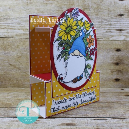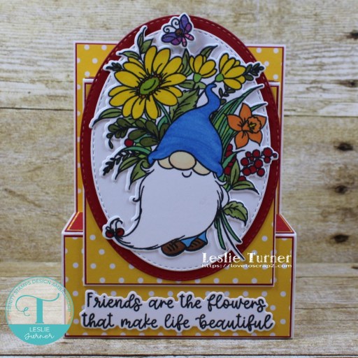 OH! you are so prolific in your cardmaking Leslie, I would love to think of just one card design and you come out with lots and lots. I love this card, the fold, the fab gnomes and the wonderful flowers, all beautifully coloured. Did I say I love this?