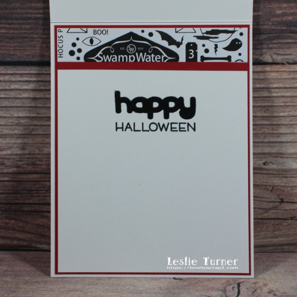 I cut the inside panel from Neenah Classic Crest 80# Solar White cardstock and embellished it with a leftover piece of the Halloween patterned paper and a strip of CutCardStock Basis Red cardstock. I added the die cut and stamped sentiment, and layered the panel on red cardstock.