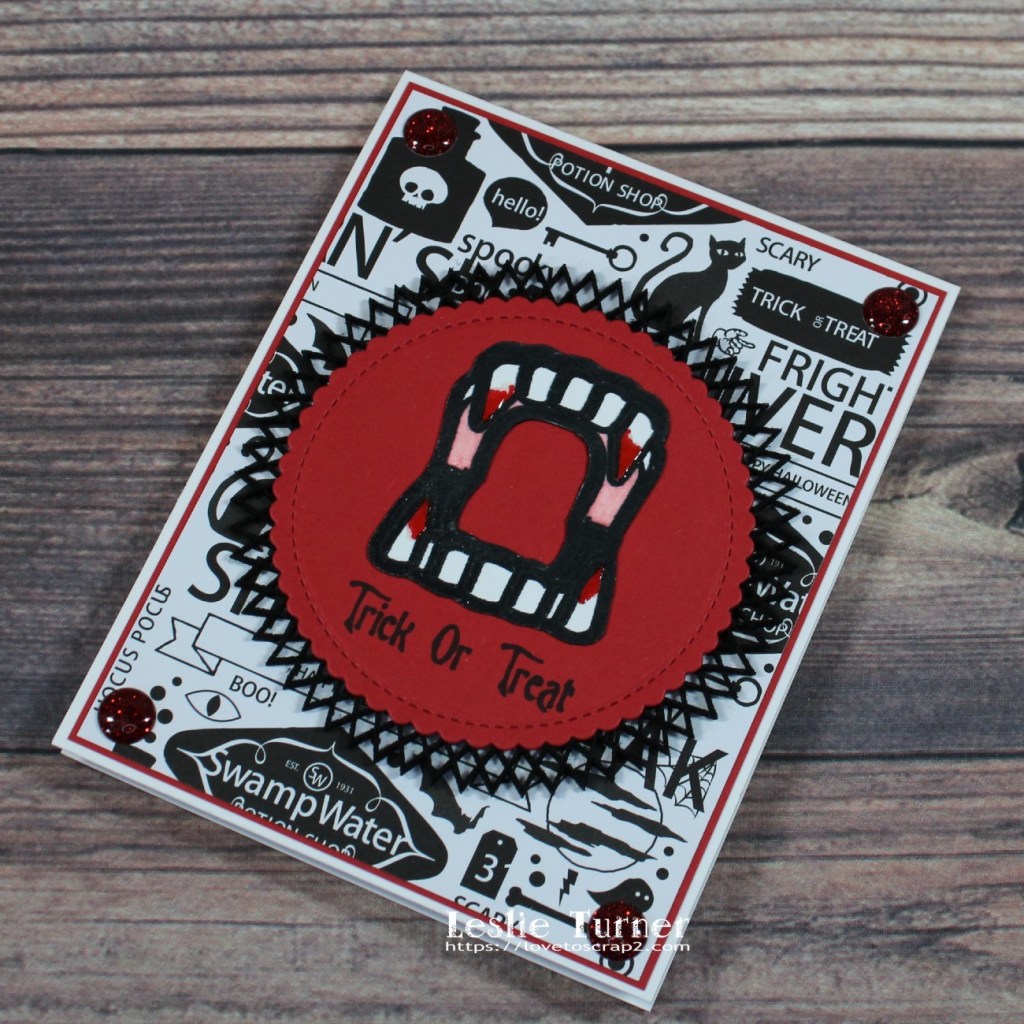Hi friends! I’m back on this fine Sunday evening to share the last of the Halloween cards I made this year. This one is, by far, the creepiest one, lol! But it was a fun one! Affiliate links are used in this post at no cost to you – I really appreciate your support! I used a couple Brutus Monroe products from my stash on this card – the teeth stamp set and the felt doily.