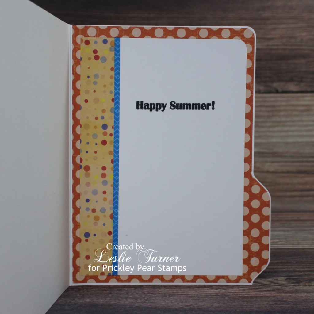 I cut the inside panel from another coordinating print from the Crafter’s Companion Just For Men Brights Collection 6×6 paper pad and adhered it to the inside of the card base. I cut a layering panel from Neenah Classic Crest 80# Solar White cardstock and embellished it with a strip of the patterned paper used on the front and a strip of skinny washi tape. I stamped the sentiment from the Ham Camper Summer stamp set in black ink and adhered it to the inside.