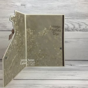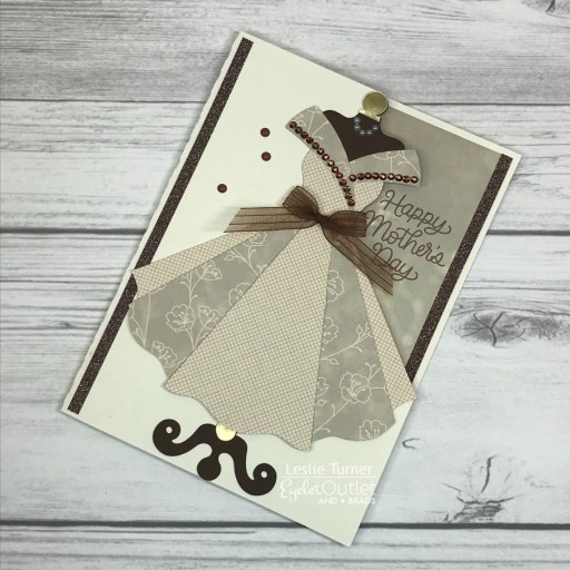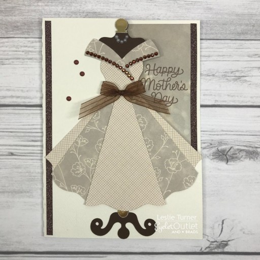 I cut all the pieces from CutCardStock Royal Sundance Felt Natural cardstock, CutCardStock Basis Brown cardstock, Hygloss Gold Metallic Foil cardstock and Stampin’ Up Falling In Love DSP. I stamped the sentiment from Pretty Pink Posh Happy Mother’s Day stamp set in Catherine Pooler Over Coffee ink. I added Clear Jewel Bling Strips to the dress which I colored with alcohol markers, pearls from a White Pearl Bling Strip around the neck of the dress form which I also colored with alcohol markers. I added several Brown Enamel Dots to the background, Glitter Brown Skinny Washi Tape strips down each side and a brown ribbon bow to complete the front.