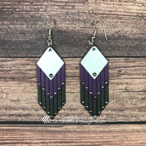 This first pair is made entirely of cardstock. I die cut the pieces for each earring from Curious Metallic White Silver, Curious Metallic Violette and Curious Metallic Night. I assembled them with Bearly Art precision craft glue, affixed the earring wires and rings, and then adhered tiny clear gemstones.