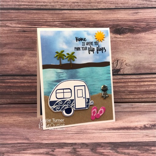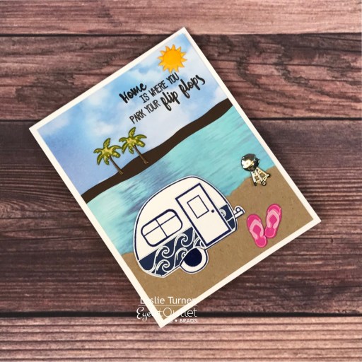 Hi everybody! A very Happy Saturday to you – I hope you’ve had a great week! I’m happy to be back on the Eyelet Outlet blog today with another awesome DT inspiration project! I created a super cute card which is perfect for that RVing beach-loving friend! Everybody has a few of those, right?! This was a fun scene to create and features our Water Washi Tape, Sky Washi Tape Wide, Tall Palm Tree Brads, Sun & Cloud Brads, BBQ Brads and Flip Flop Brads.