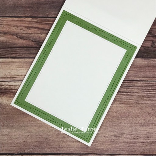 I cut the inside panels from CutCardStock Stardream Metallic Fairway cardstock and 80# Solar White cardstock using the MFT Wonky Stitched Rectangle STAX Die-namics and the MFT Stitched Rectangle STAX Die-namics, which I layered together. Since this is a note card, I left the inside blank with plenty of room to write a custom message.
