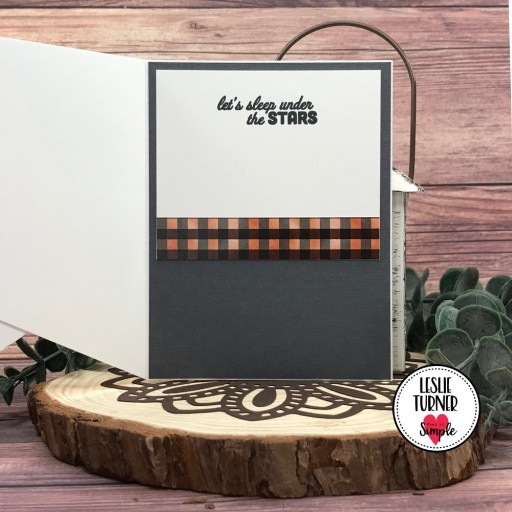 I cut a short inside panel from 80# Solar White cardstock along with a full size layering panel from CutCardStock Shadow Gray cardstock. I stamped a sentiment from the Lumberjack Camping Stamps in Memento Tuxedo Black ink and layered the panel on the gray cardstock along with a buffalo check strip from the Lumberjack Collection Pack 6×6 Cardstock.