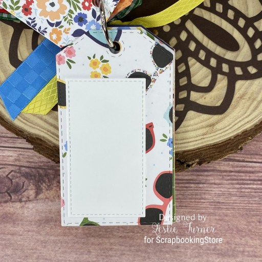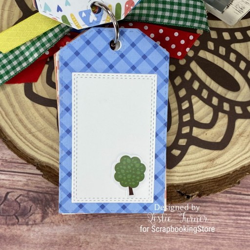 I die cut eight tags from Neenah Classic Crest 110# Solar White cardstock using a tag die from the STAMPlorations Stitched Tags Nesting Dies which became the pages of the album. I die cut two additional tags from patterned papers in the collection to cover the front and back of each page.