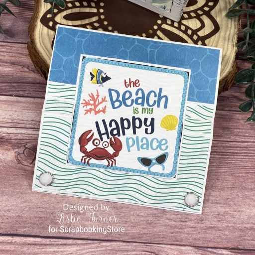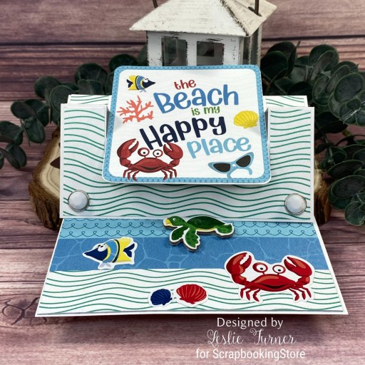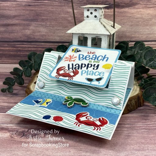 Howdy peeps! Happy Thursday – we’re one day closer to the weekend! I’m happy to be back to share another ScrapbookingStore DT inspiration project with you today created with the amazing July 2023 Scrapbook Kit with Upgrades. The papers and stickers in this collection are so fun, and they are great for creating beach-themed fun folds! I created this swing easel card using papers and stickers along with a chipboard element and adhesive brads from the upgrades, and it’s full of waves and critters! It can’t get any more fun than this!
