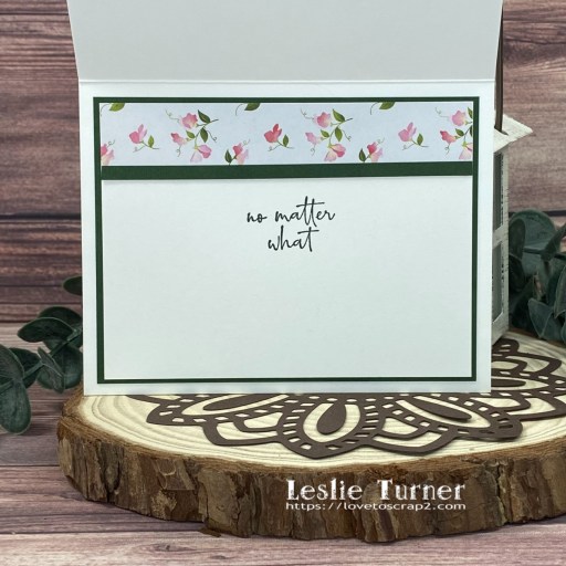 I cut the inside panel from 80# Solar White cardstock and embellished it with strips of the floral print and dark green cardstock used on the front. I stamped a sentiment from the Stampin’ Up Happy & Heartfelt stamp set in Memento Northern Pine ink.