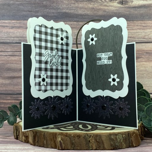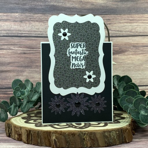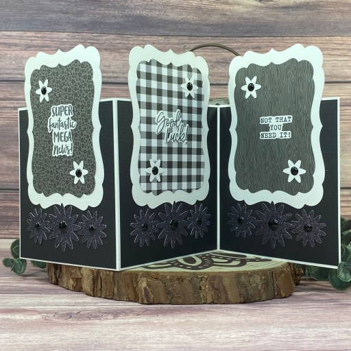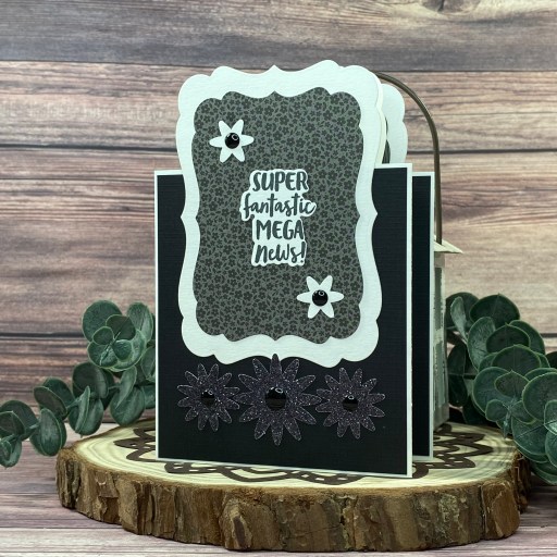 Using the Stampin’ Up Blossom Bunch Punch, I punched quite a few flowers from Silk Glitter Black Prince cardstock and Basis White cardstock, and added Eyelet Outlet Black Enamel Dots to the centers of each. I adhered them across the bottom of the three panels and on each decorative panel. I stamped the sentiments from the Stampin’ Up Charming Sentiments stamp set in Catherine Pooler Black Jack ink and cut them with the coordinating Stampin’ Up Sentiment Silhouettes Dies.