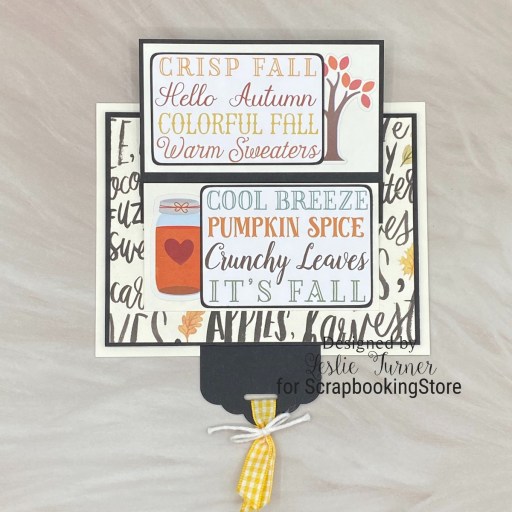 Hi everyone! I hope your week is plugging along nicely! I have an amazing ScrapbookingStore DT inspiration project to share that I created with the awesome November 2023 Scrapbook Kit with Upgrades! I’m sure by now you know that the Autumn/Fall season is my favorite. I totally love all the coordinating papers and stickers along with the upgrades in this month’s kit and I created a pull tab flip card featuring papers, stickers and a chipboard phrase from the upgrades. This is such fun fold and my inspiration came from Aubrey over at Stamping Jill through another friend, Debbie. Tutorials for both landscape and portrait options are available on the Stamping Jill website.