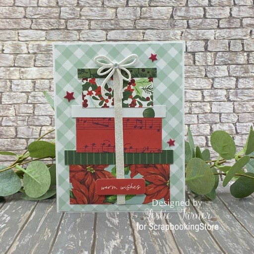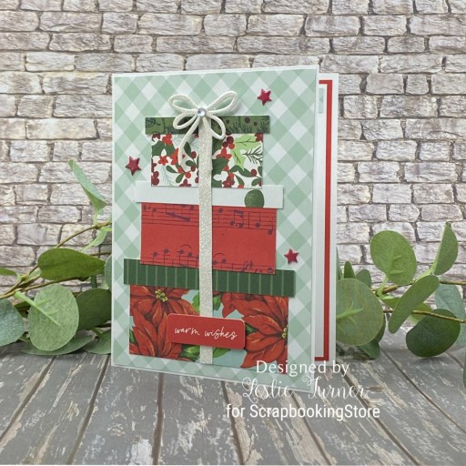 Hey everybody! Happy Tuesday – I hope your week has started off on a nice note! I have a pretty ScrapbookingStore DT inspiration project to share with you today created with items in the December 2025 Scrapbook Kit with Upgrades. This card features three stacked gifts created from assorted prints in the Simple Stories All Wrapped Up Collection Kit. I also used elements from the Rosie’s Studio Oh Joyful Day Puffy Stickers and Carta Bella Christmas Flora Ephemera, both from the upgrades.