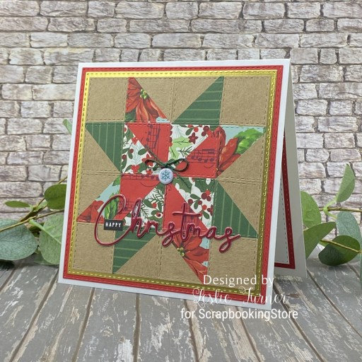 I cut the 5-1/2″ square card base from Neenah Classic Crest 110# Solar White cardstock along with two stitched square die cuts which I cut from CutCardStock Basis Red and Bright Gold Foil cardstock using Love From Lizi Stitched Square Nested Cutting Dies. I cut eight smaller stitched squares (using the same die set) from assorted prints in the Simple Stories All Wrapped Up Collection Kit and eight more from CutCardStock Brown Bag Kraft. I cut several of them in half diagonally and then glued them down in a quilt block pattern on a piece of copy paper.