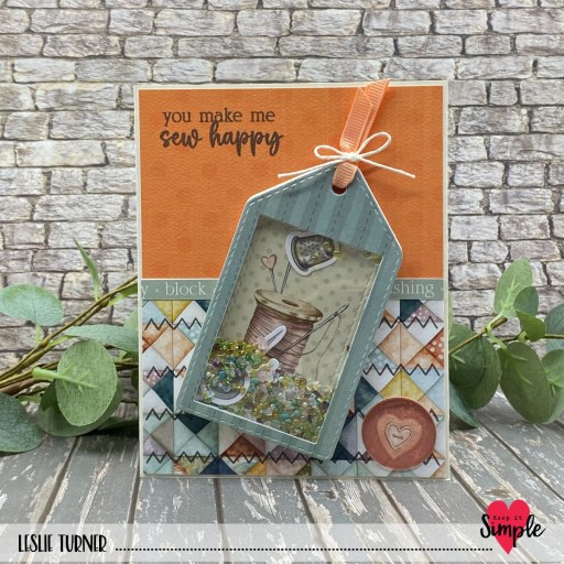 I used faux stitching and sentiment stamps from the Cheerful Cottage collection, a sentiment border from the bonus cut-apart sheet, and a Back To Basics Epoxy Circle on the front. I totally love shakers and this tag shaker is really fun!