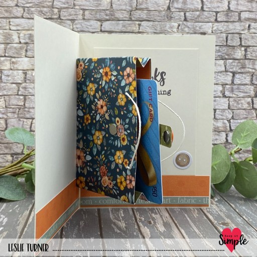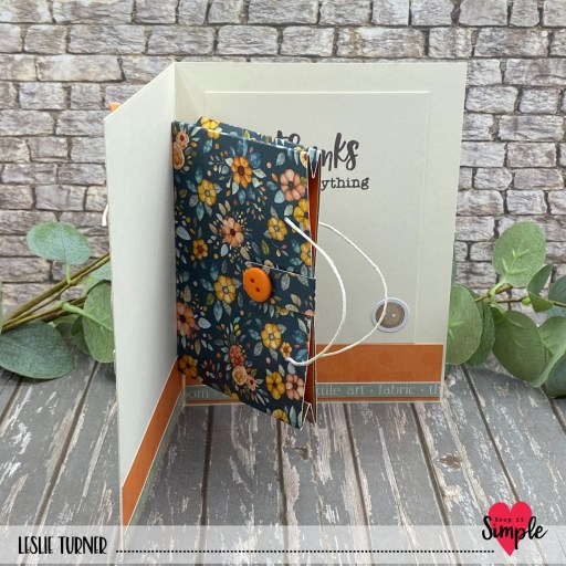I fashioned the pop-up gift bag on the inside from a floral print in the Cheerful Cottage collection, using Lawn Fawn white hemp twine for the handles, and embellished the magnet closure with a Crafty Girls button. I stamped a sentiment from the Back To Basics Thank You Sentiments Stamp Set in brown ink and embellished the panel with a button die cut piece, and this completed the inside.