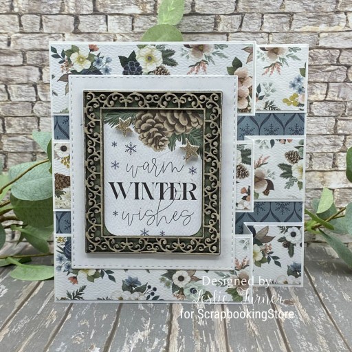 I cut the card base pieces and strips from Neenah Classic Crest Solar White cardstock along with layering panels from coordinating prints in the Carta Bella Winter Wonderland Collection Kit. I used a Love From Lizi Stitched Stitched Rectangle Nested Cutting Die to create the background for the focal panel. I added a Little Birdie Scroll Border Frame from the upgrades and then tucked a trimmed journaling card inside the frame. I finished off the front with (yep, you guessed it…) two stars from the Rosie’s Studio Glitter Foam Stickers from the upgrades.