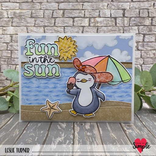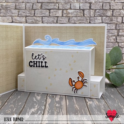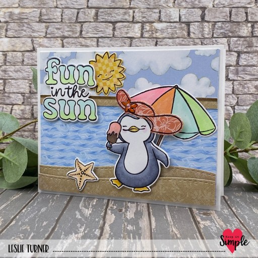 Hey everybody, happy Friday! With all the warm-weather projects I’m seeing around blogland and on the socials, I think just about everybody is ready for the cold weather to go away. Seems like Winter has just lingered, hasn’t it?! I’m delighted to share this interior stair step card with you today for Keep It Simple! This is another fun fold that I saw on Connie Stewart’s blog and it is indeed a fun one. It features papers, stamps, dies and die cut pieces from the new Summer Penguins collection! Talk about C-U-T-E… and needless to say, I had fun creating this little beach scene!