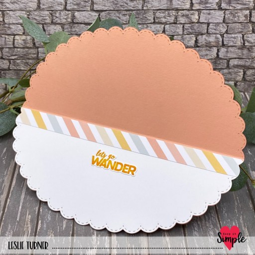 I cut two more half-scallops from the Coral and Solar White cardstock (using the same set of dies and my large die cutting machine) for the inside and embellished it with a strip of the striped paper used on the front. I stamped a sentiment from the Wander Collection Stamps in Catherine Pooler Sauna and Orange Peel inks (using the rock-and-roll technique), and cut it with the coordinating Wander Outline Die.