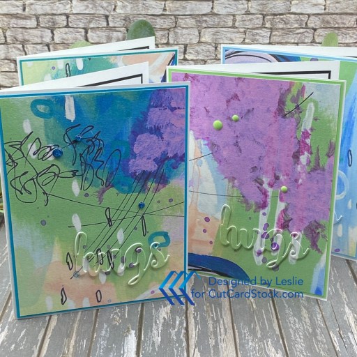 I used the CUTplorations hugs die (from STAMPlorations) and two layers of 165# Solar White cardstock to get the raised 3D effect. I used Scrapbook Adhesives adhesive sheet for several steps which was a huge time saver. I really dislike dabbing tiny spots of glue on the back of small die cuts, lol! The panels were put on 80# pre-folded Solar White card bases (another huge time saver) and I added Eyelet Outlet Teal, Aqua Glitter, Blue and Green Enamel Dots to finish off the card fronts.