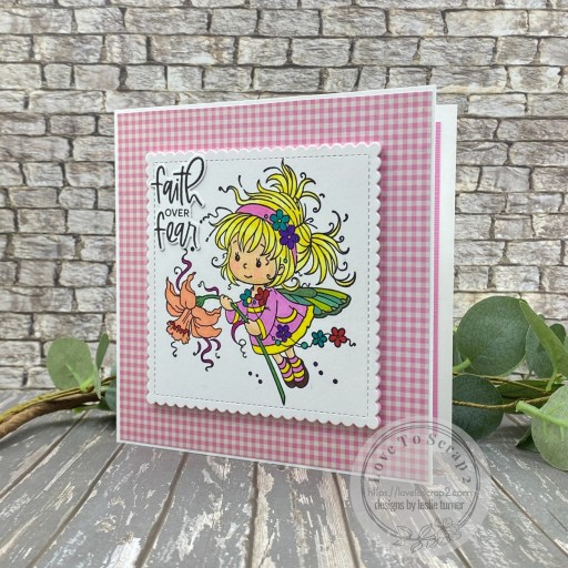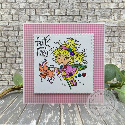 I added some shimmer to her wings with Sakura Clear Star Gelly Roll pen, cut the image with a My Favorite Stamps Stitched Mini Scallop Square STAX die, and added Scrapbook Adhesives Adhesive Sheet to the back. I cut some pink craft foam with the same MFT die and layered it beneath the image panel for a little interest, and adhered the piece to the card front with Scrapbook Adhesives Crafty Power Tape. I added a sentiment stamped in Versafine Onyx Black ink (from the Stampin’ Up Charming Sentiments stamp set) and cut with the coordinating Stampin’ Up Sentimental Silhouettes die.