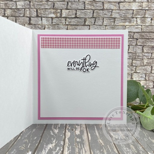 I cut the inside panel from 80# Solar White, embellished it with a strip of the gingham paper used on the front, and layered it on CutCardStock Pink Tutu cardstock. I stamped the inside sentiment (from the same Stampin’ Up stamp set) on a Solar White scrap and die cut it with the coordinating Stampin’ Up die.
