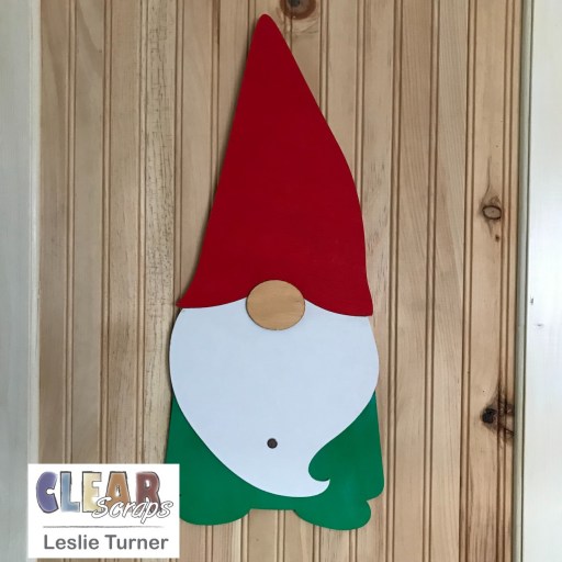 Hey, everybody! Hope you’re having a wonderful weekend! Dang. I can’t believe July is half over already! I’m thrilled to be back on the Clear Scraps blog today with another awesome DT inspiration project! I am really loving gnomes these days and there are so many different ones out there… short, tall, stamped, die cut, male, female, and the list goes on! This dude, created with the XL Wood Gnome 2, is a giant, standing over 20″ tall! He comes with a stand but I fashioned him to hang on a front door to hold different seasonal add-on elements all year long! You’ll get a peek of only one of those add-ons in this post but you’ll see all 12 of them in my final Clear Scraps post in just a few days! So stay tuned… saving the best for last!