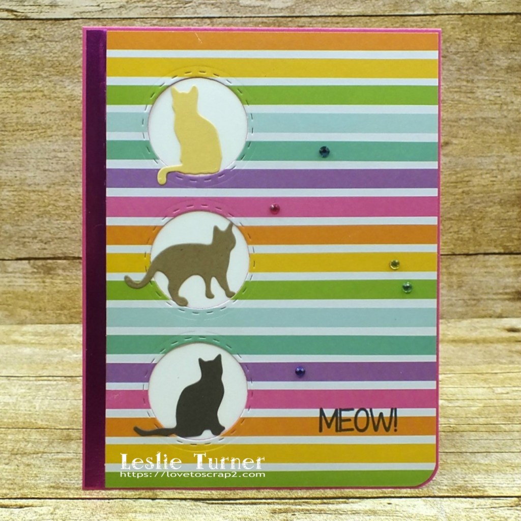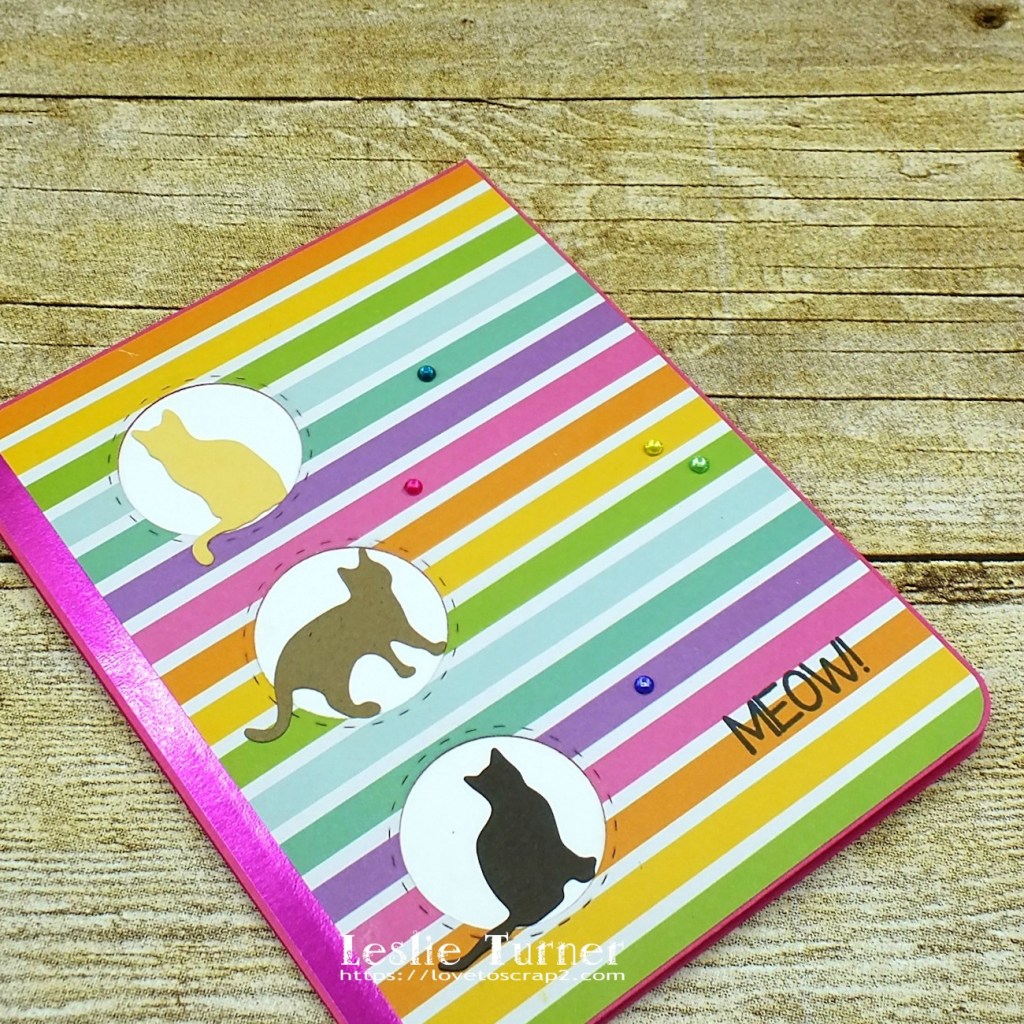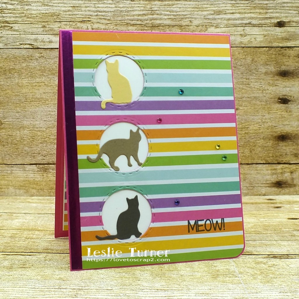 I created a standard A2 size top-folding card base from hot pink cardstock (still in the pink mode, lol), and cut an ever-so-slightly-smaller panel from striped paper and a narrow strip of hot pink foiled paper that actually looks purple in the first two photos… but I promise it’s hot pink! I die cut a trio of circular openings through both layers and then adhered a white panel behind it. I added several die cut cats, the sentiment stamped in black ink, and a few matching gemstones to complete the front. Super simple design!