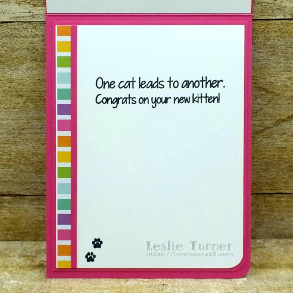 I embellished the inside panel with a leftover strip of the striped paper and a very thin strip of hot pink cardstock, stamped the sentiments and tiny paw prints in black ink, and layered the panel on hot pink cardstock for a tone-on-tone look.