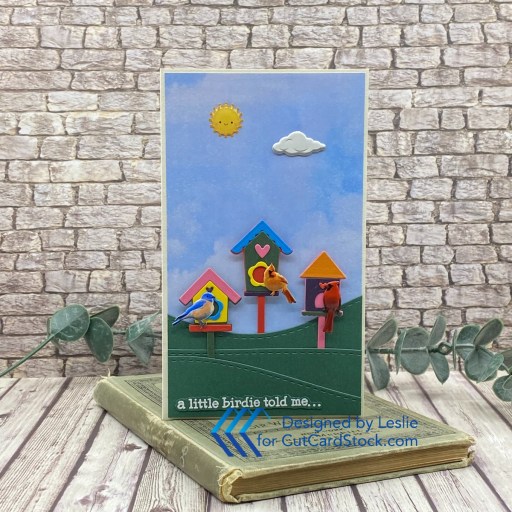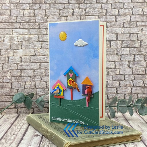I cut my go-to 3-1/2″ x 6″ mini slimline card base from Classic Crest Baronial Ivory cardstock. I printed the Background Labs Cloud digital background on 32# HP copy paper on my new Canon color laser printer and trimmed it to fit the mini slim card base. I have a background story on printers but I’ll save that for another day, lol! Next, I die cut the bird houses from the Catherine Pooler Home Tweet Home Dies in seven of the eight Lessebo cardstock colors I had out. Since there were so many dies in this set, I left them connected so I wouldn’t lose any of them, and it worked out well. Now I have lots of extra pieces in all those pretty colors to assemble more bird houses for future projects. ;)