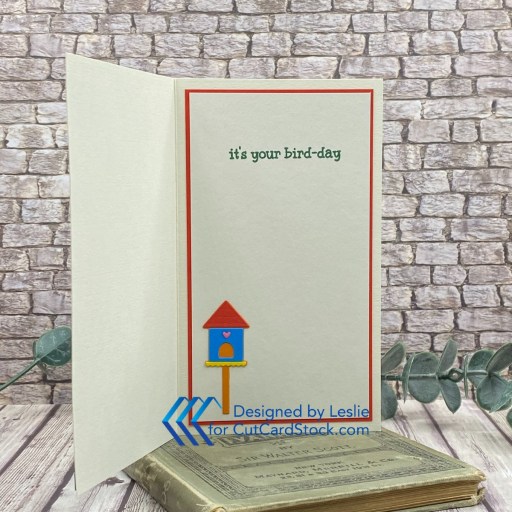I cut the inside panel from Classic Crest Baronial Ivory and embellished it with another bird house. I stamped another sentiment from the same Build-A-Birdhouse stamp set in Memento Cottage Ivy ink, and layered the panel on Cherry Red cardstock.
