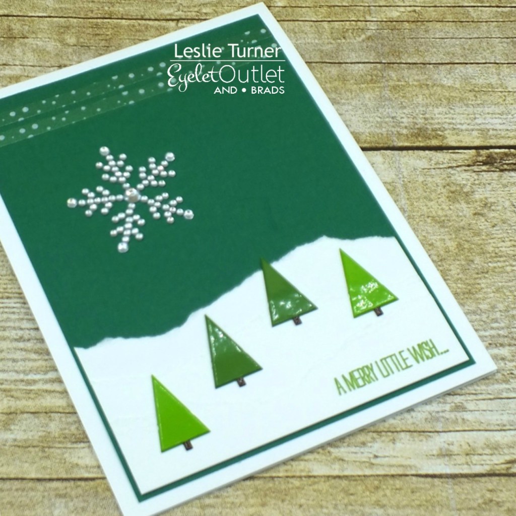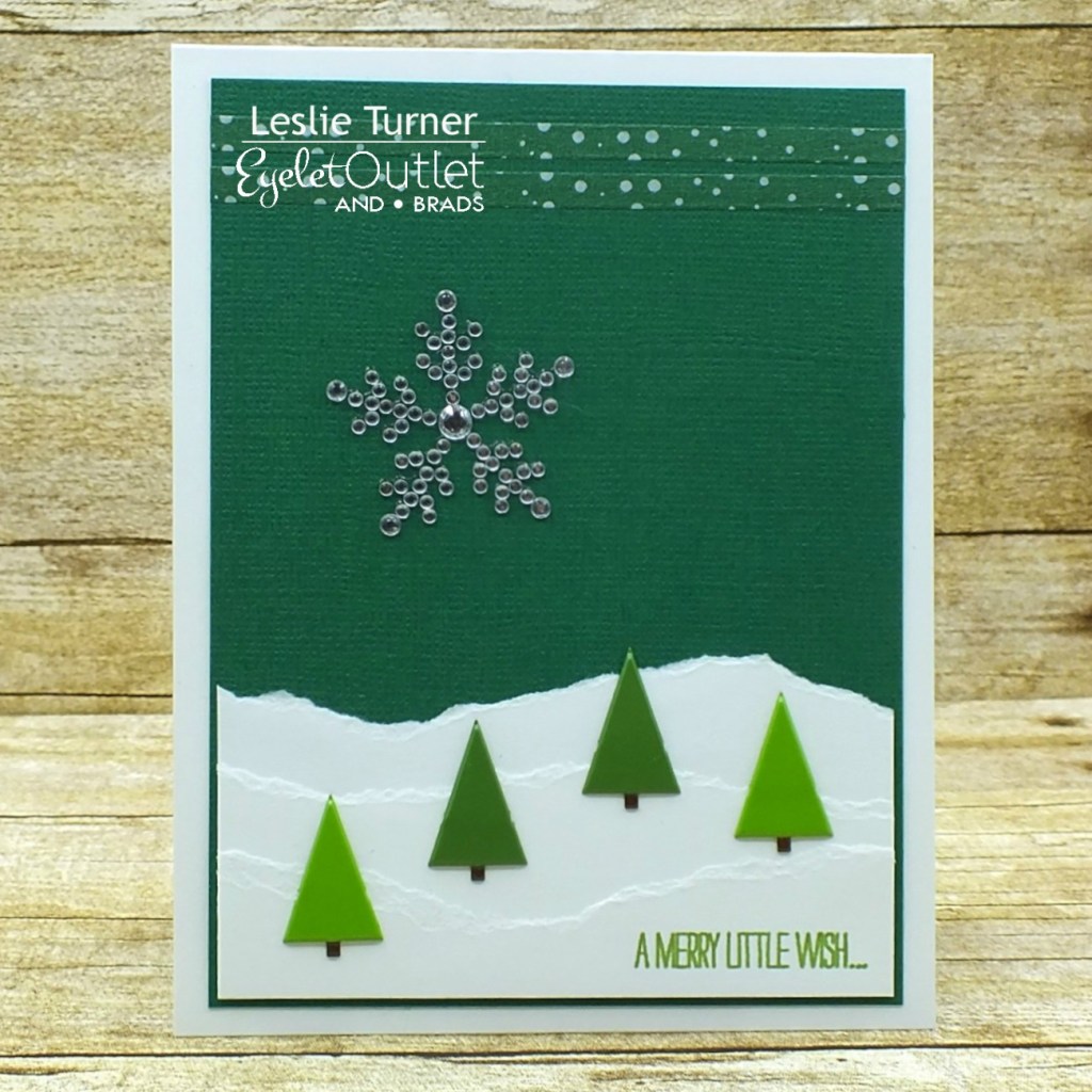 This was another fun one to watch come together. I cut a standard A2 top-folding card base and a green cardstock layer. I created three snow banks by tearing white cardstock, adhered them to the bottom of the green panel, and then added several Holiday Tree Brads and a stamped green sentiment. I applied two strips of Green Dots Skinny Washi Tape at the top of the green panel and adhered the panel to the card base. The final touch was adding Snowflake Bling.