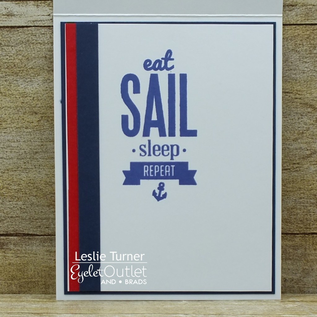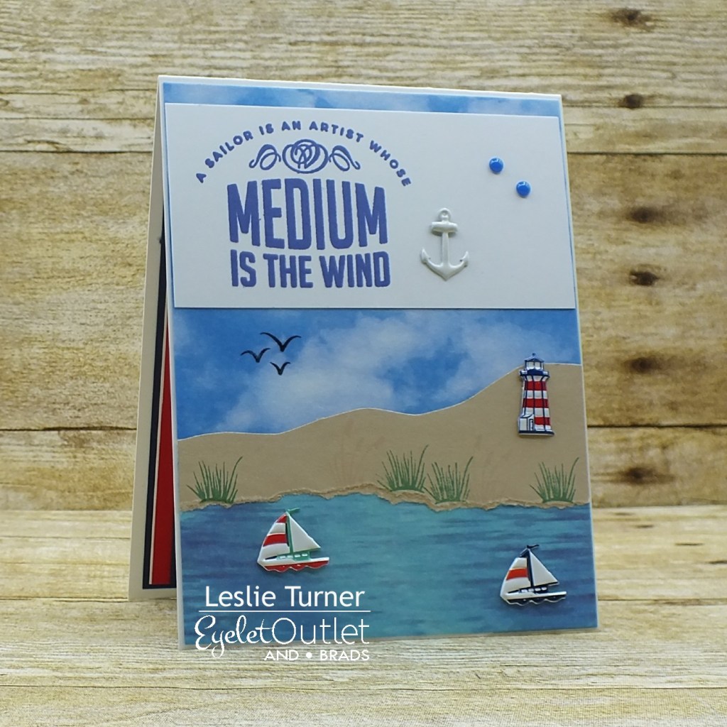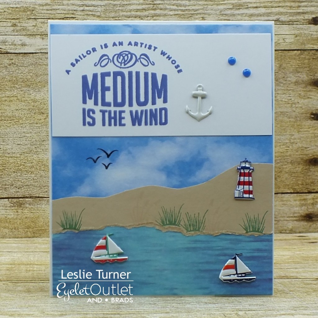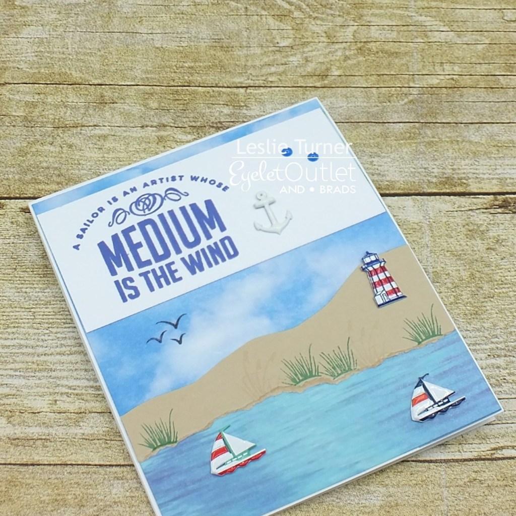 Hey everybody, a very Happy Saturday to you – and it’s the last day of July! Hope you’ve had a good week! I’ve been busy in my studio and that makes me a happy camper! I’m happy to be back on the Eyelet Outlet blog today with another awesome DT inspiration project! I created a masculine nautical-themed card featuring our Boat & Lighthouse Brads, which are new in the store this month, and paired them with our Anchor Brads along with our Wide Sky Washi Tape and Water Washi Tape! I use these two washi tape patterns together a lot because they create the coolest water/beach scenes ever!