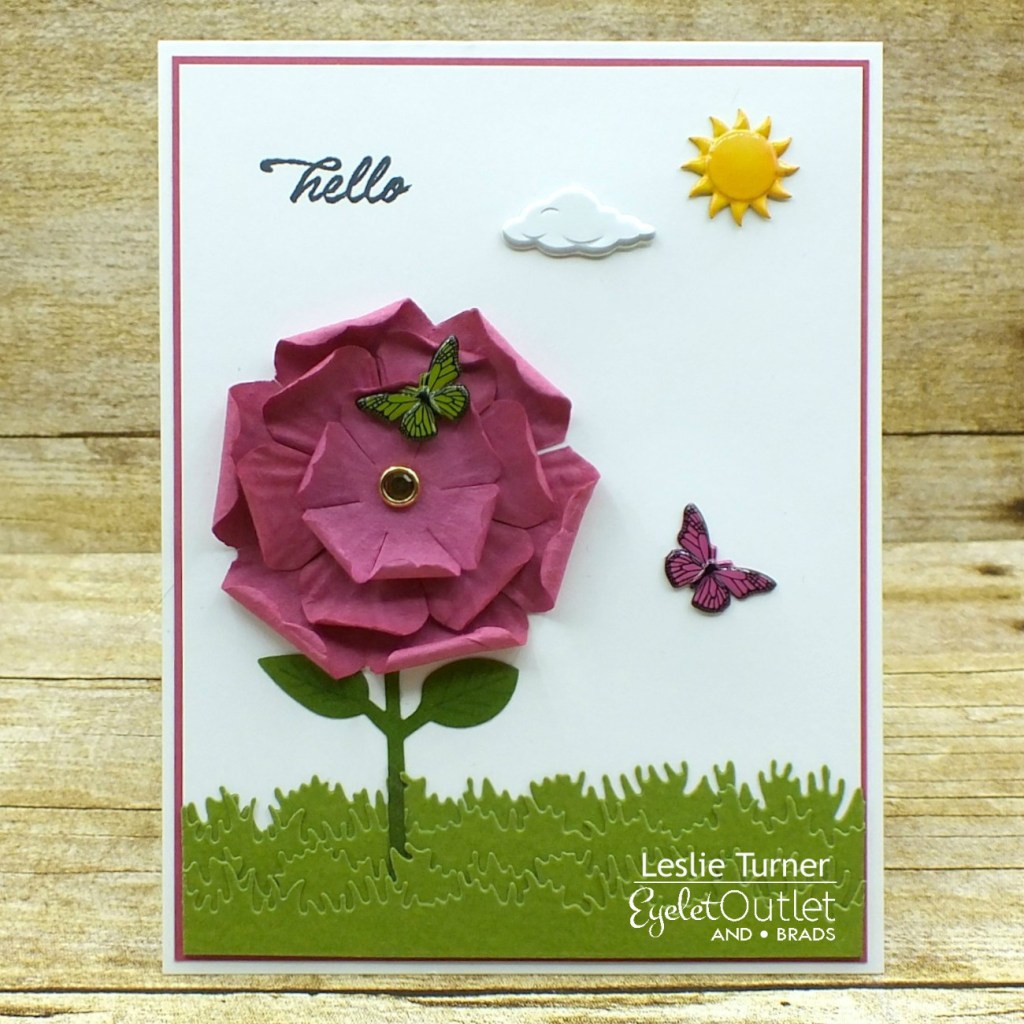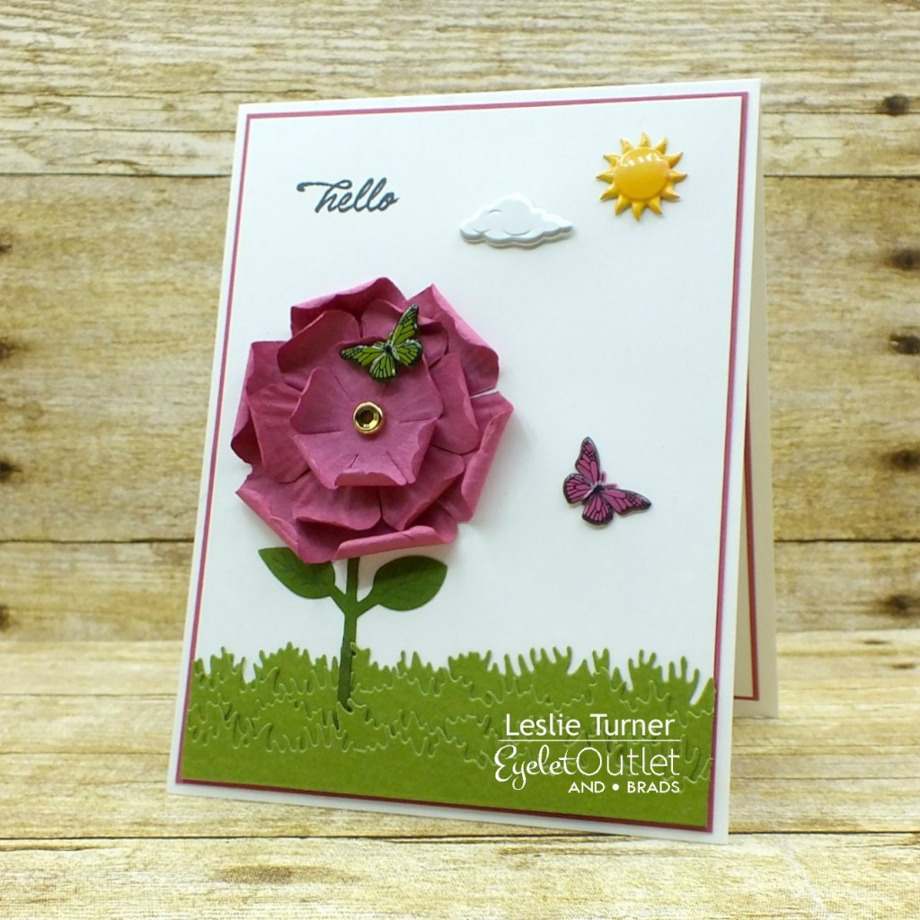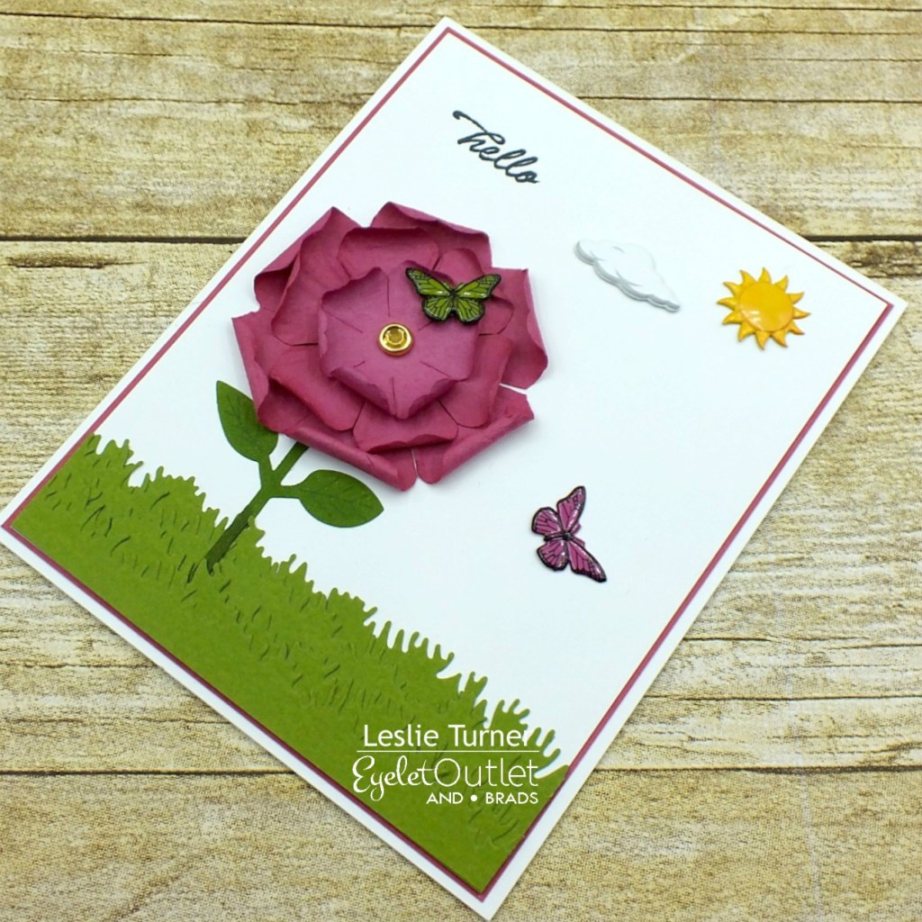 I settled on a pink and green color combo which is another color combo favorite. I pulled out a lonely grass border die from my stash that doesn’t get a lot of use, cut several grass borders, and layered them across the bottom of the front panel. Using a leaf punch, I punched a stem and leaves, and adhered it to the front panel. I curled the edges of all three layers of a Paper Flower, attached them with a 6mm Amber Jewel Brad and adhered the flower to the front panel. I added two Butterfly Brads and Sun and Cloud Brads. I stamped a simple sentiment in black ink in the upper left corner.