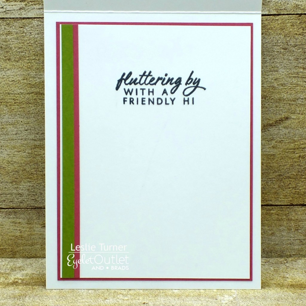 I embellished the inside panel with a couple leftover strips of the green and pink cardstock used on the front, stamped the inside sentiment in black ink and layered the panel on the pink cardstock.