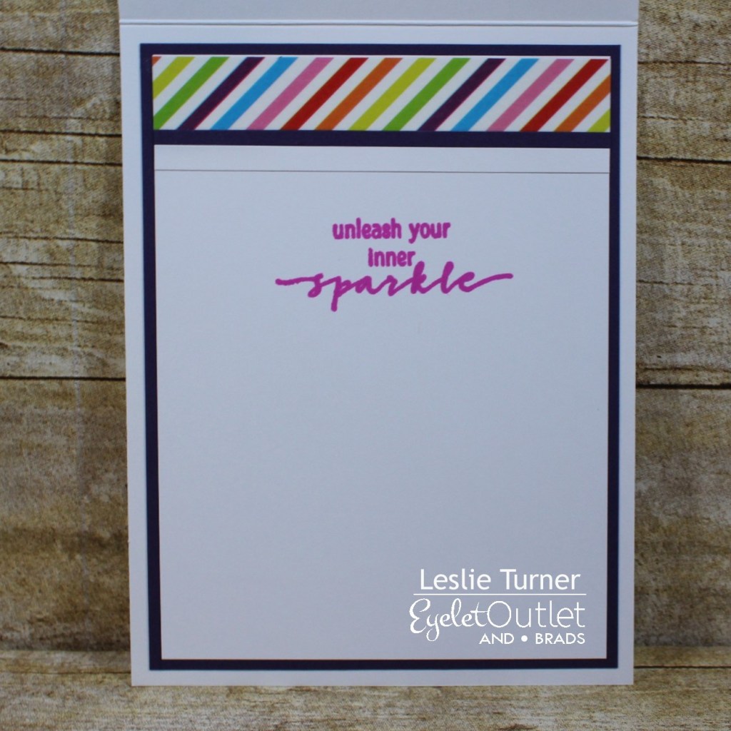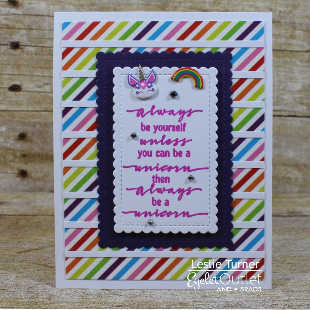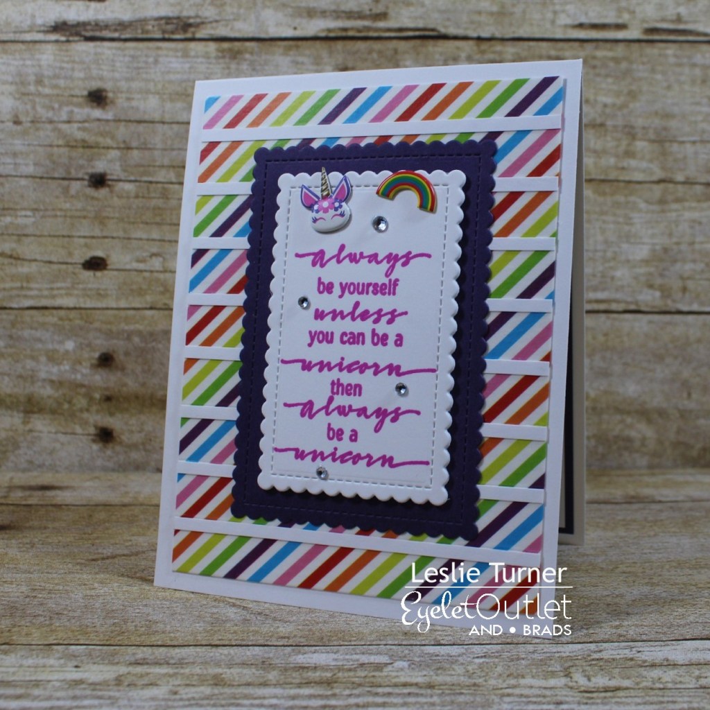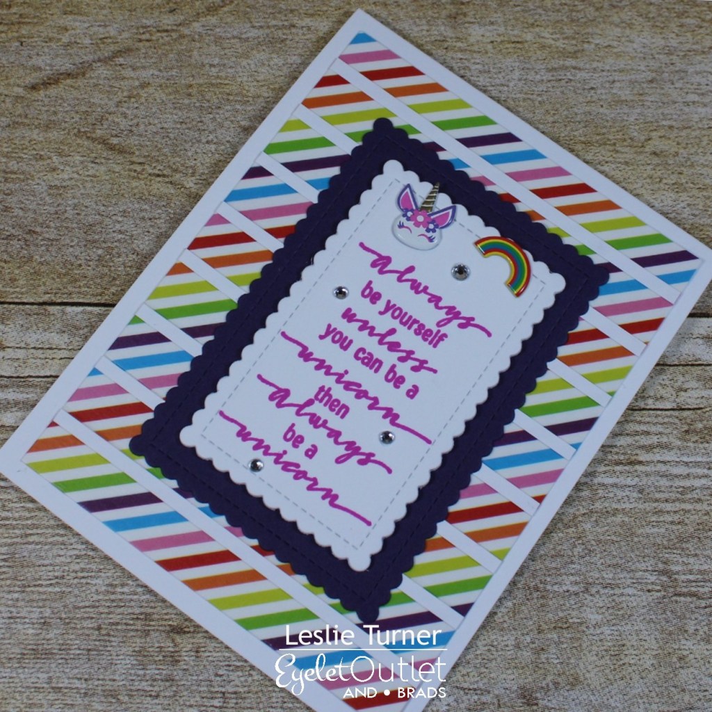 Hi everyone! A very Happy Saturday to you – I hope you’ve had a great week! This month is flying by just like all the rest, lol! Affiliate links are used in this post at no cost to you. I really appreciate your support! I’m stoked to be back on the Eyelet Outlet blog today with another awesome DT inspiration project! I created a sweet inspirational card featuring our Unicorn & Rainbow Brads, Striped Washi Tape and Clear Jewel Bling! I sure do love me some bright rainbow colors, and this was definitely a fun one! This washi tape sure makes a striking background! ;)