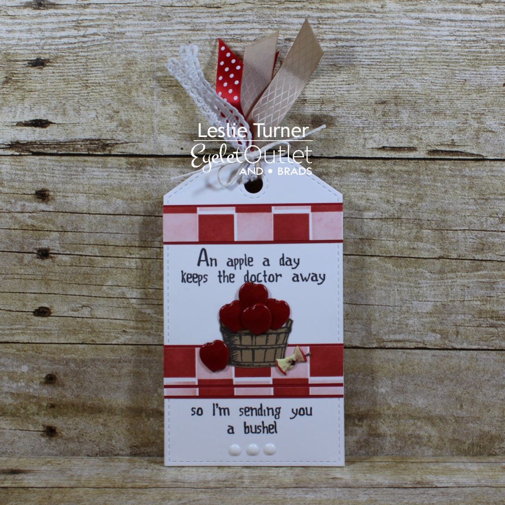 Hi everyone! A very Happy Saturday to you – I hope you’ve had a great week! They sure are going by fast these days… Christmas will be here before we know it, lol! Okay, I see your eyes rolling! ;) Affiliate links are used in this post at no cost to you. I really appreciate your support! I’m stoked to be back on the Eyelet Outlet blog today with another awesome DT inspiration project! I created a get well tag featuring some awesome brads with a matching stamp set and my favorite enamel dots!