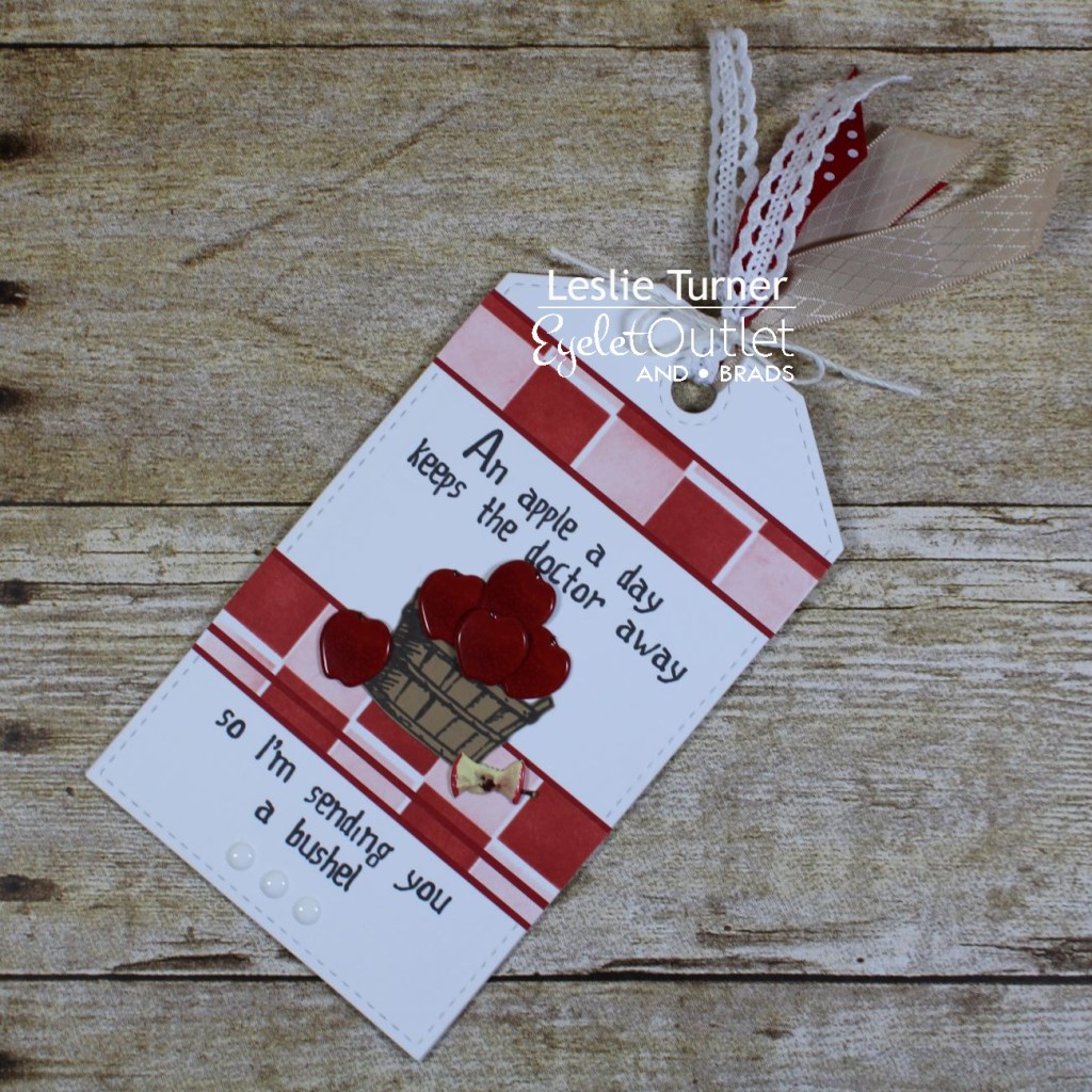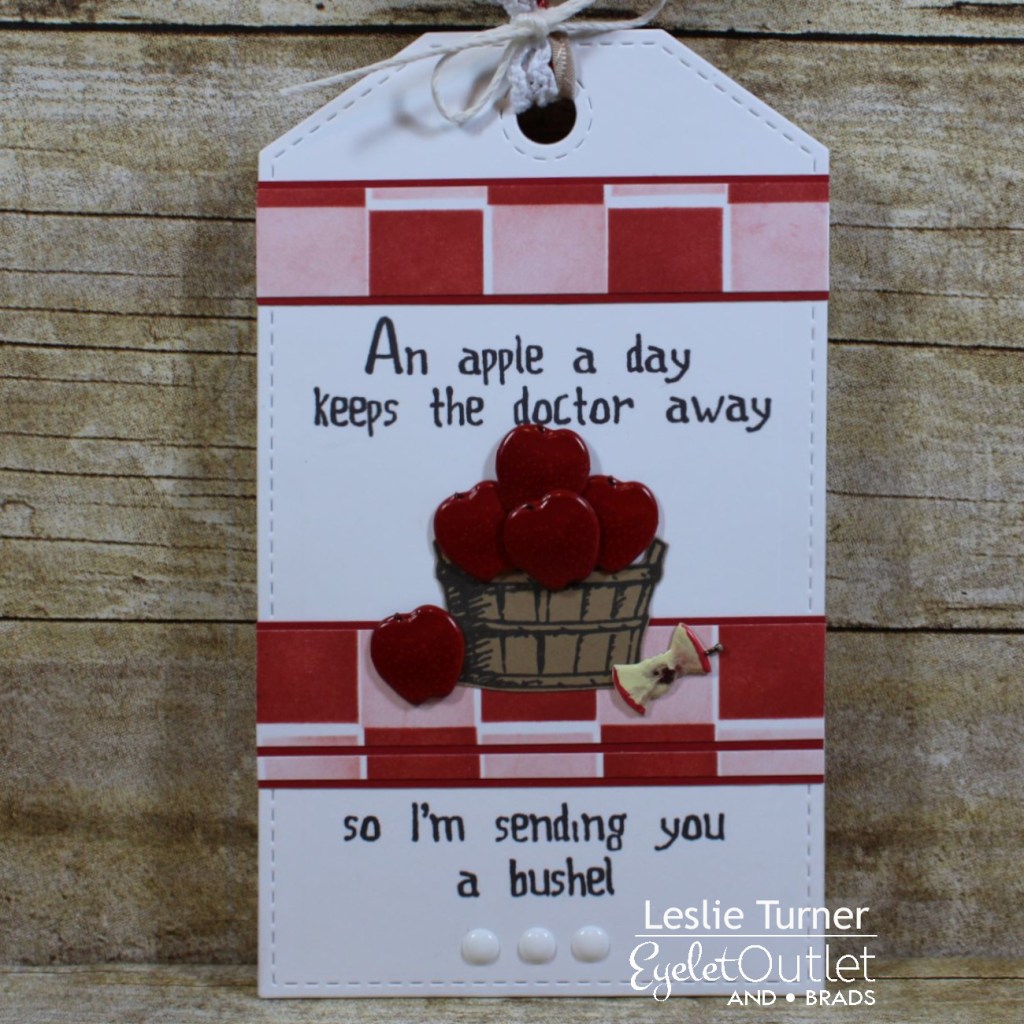 Using the CUTplorations Stitched Tags Nesting Dies, I die cut two stitched tags from Neenah Classic Crest Solar White 110# cardstock and one from CutCardStock Basis 80# Red cardstock. I created a faux tablecloth by stenciling Ranger fired brick distress ink onto an ARTplorations Checkers Stencil with a blending brush and cut it into strips. I adhered the strips to red cardstock strips and then to one of the white cardstock tags. Using the Apple Clear Stamp Set, I stamped the basket in brown ink on CutCardStock Basis 80# Light Brown cardstock, fussy cut it, and adhered it to the lower stenciled strip, and then stamped the sentiment from the same stamp set in brown ink. I put four Apple Brads in the basket and one outside the basket along with an apple core. I adhered the two white cardstock tags to the red one, and then threaded three ribbons through the hole at the top of the tag and tied them with bamboo crafting cord. The finishing touch was the addition of three White Enamel Dots across the bottom.