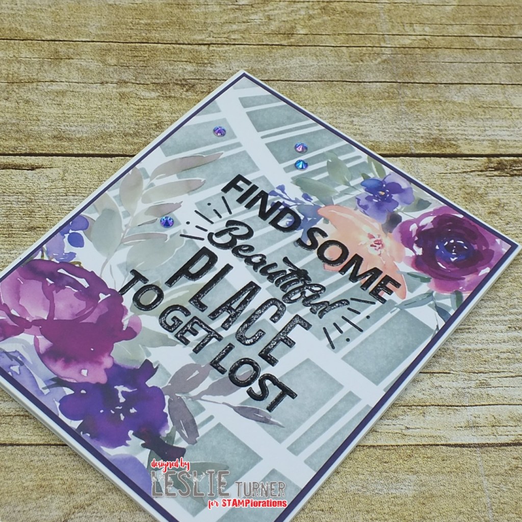 I cut a standard A2 size top-folding card base from Neenah Classic Crest Solar White 110# cardstock. I grabbed a pretty A2 Card Front from the CRAFTplorations Quick Cards #3 – Spring Florals pack and masked off the flowers and leaves in the corners. Using the ARTplorations Almost Shattered Slimline Stencil, I applied iced spruce distress ink with an ink blending brush over the large open area. I stamped the STAMPplorations Beautiful Place To Get Lost sentiment in Memento Tuxedo Black ink and then a second time in Versamark. I applied clear embossing powder and hit it with the heat tool. I discovered this trick years and years ago to get virtually any color of heat embossing and haven’t bought colored embossing powder since! I adhered the panel to CutCardStock Basis Dark Purple cardstock and adhered it to the front of the card base. The final touch was the application of several iridescent gemstones.