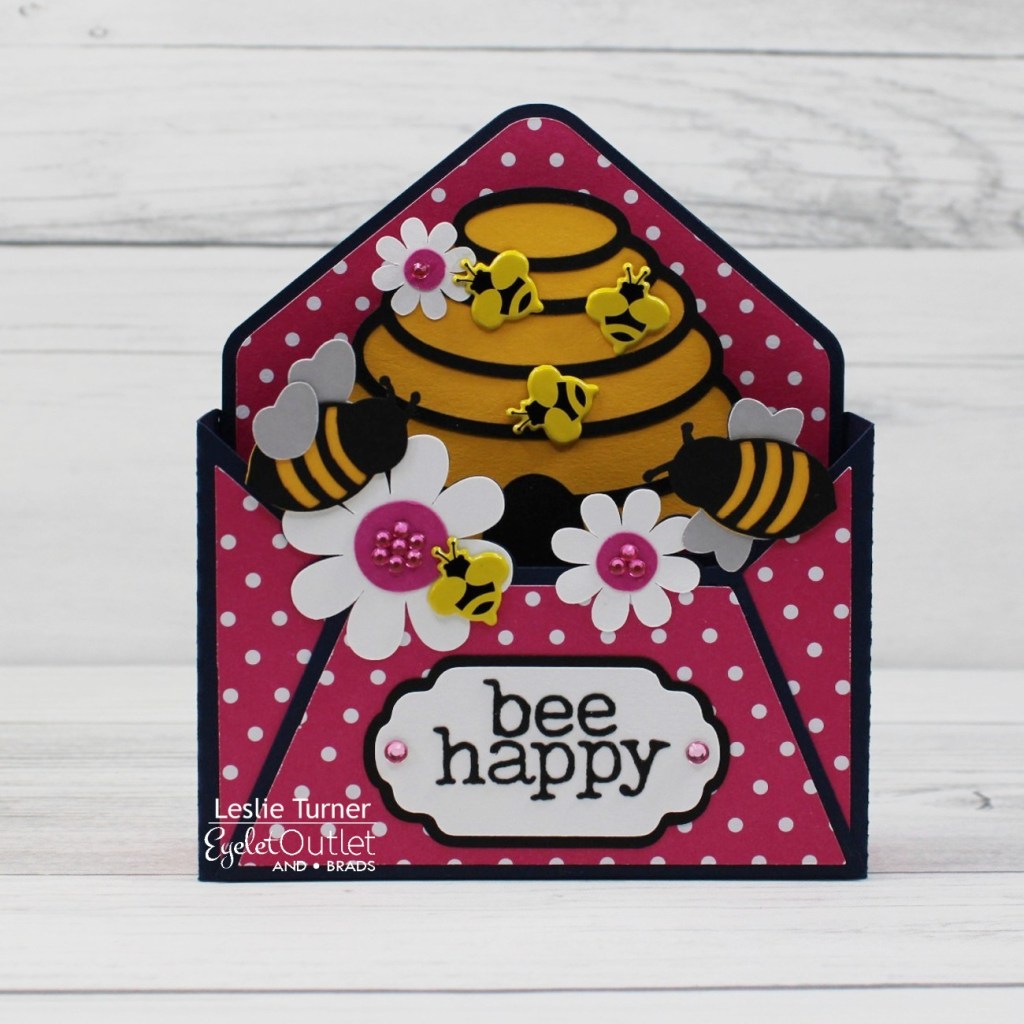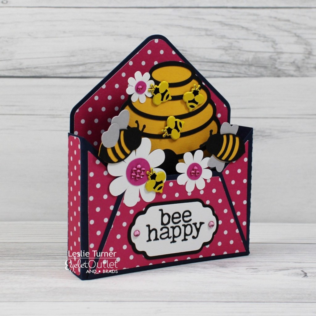 Hi everyone! A very Happy Saturday to you – I hope you’ve had a great week! Affiliate links are used in this post at no cost to you – I really appreciate your support! I’m stoked to be back on the Eyelet Outlet blog today with another awesome DT inspiration project! I created a super fun Envelope Box Card featuring our Bumble Bee Brads and Pink Jewel Bling! I love my Scan N Cut and I always cut several projects when I take it out of the cabinet for a crafty session, and this card was one from the latest batch. I really enjoyed this!