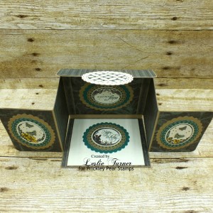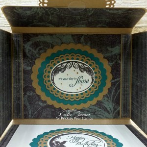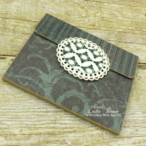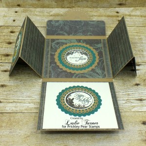 I created the card base from kraft cardstock and covered the panels with coordinating papers. I stamped an assortment of images on Neenah Classic Crest Baronial Ivory cardstock in brown and teal inks, cut them with oval and scalloped oval dies, layered them and adhered them to the panels. A couple of them required a small amount of coloring which I did with alcohol markers and I added some Crystal Drops to a couple of them. I added a velcro closure under the scalloped oval element on the front to keep it closed.