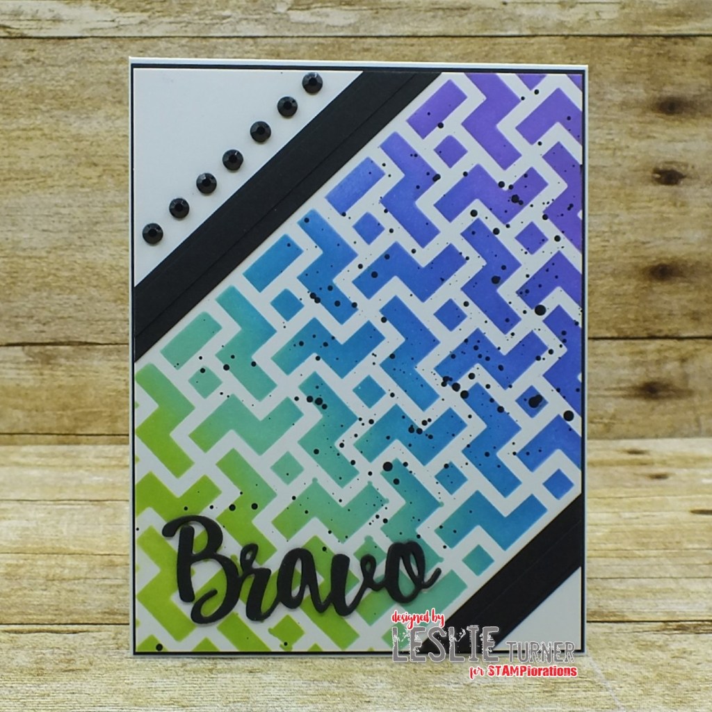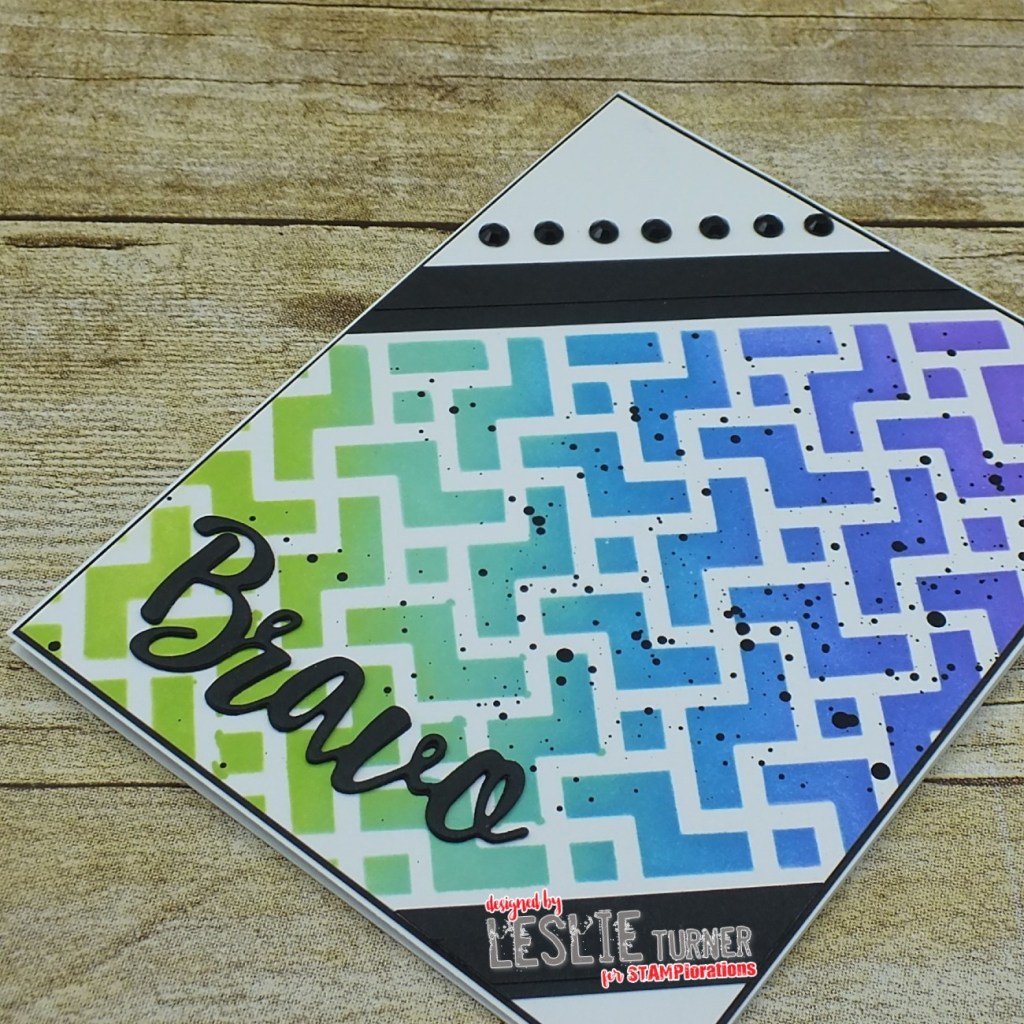 I created a standard A2 size top-folding card base from Neenah Classic Crest 110# Solar White cardstock and cut a layering panel from Neenah Classic Crest 80# Solar White cardstock. I angled the ARTplorations Almost Tetris Slimline Stencil on the white cardstock panel and applied twisted citron, cracked pistachio, mermaid lagoon, blueprint sketch, wilted violet distress inks with ink blending brushes, overlapping each color slightly as it was applied. I mixed a tiny bit of water in black gesso and flicked it onto the panel with a fan brush, protecting the corners with scrap paper. I cut two strips for each corner (a narrow one layered on top of a wider one) and a layering panel from CutCardStock Pop-Tone Black Licorice cardstock, adhered them to the panel and then adhered the panel to the black cardstock layer. Using the CUTplorations Bravo Word Die, I die cut two sentiments from the black cardstock and layered one on top of the other for a little extra dimension. The finishing touch was the addition of several black gemstones.