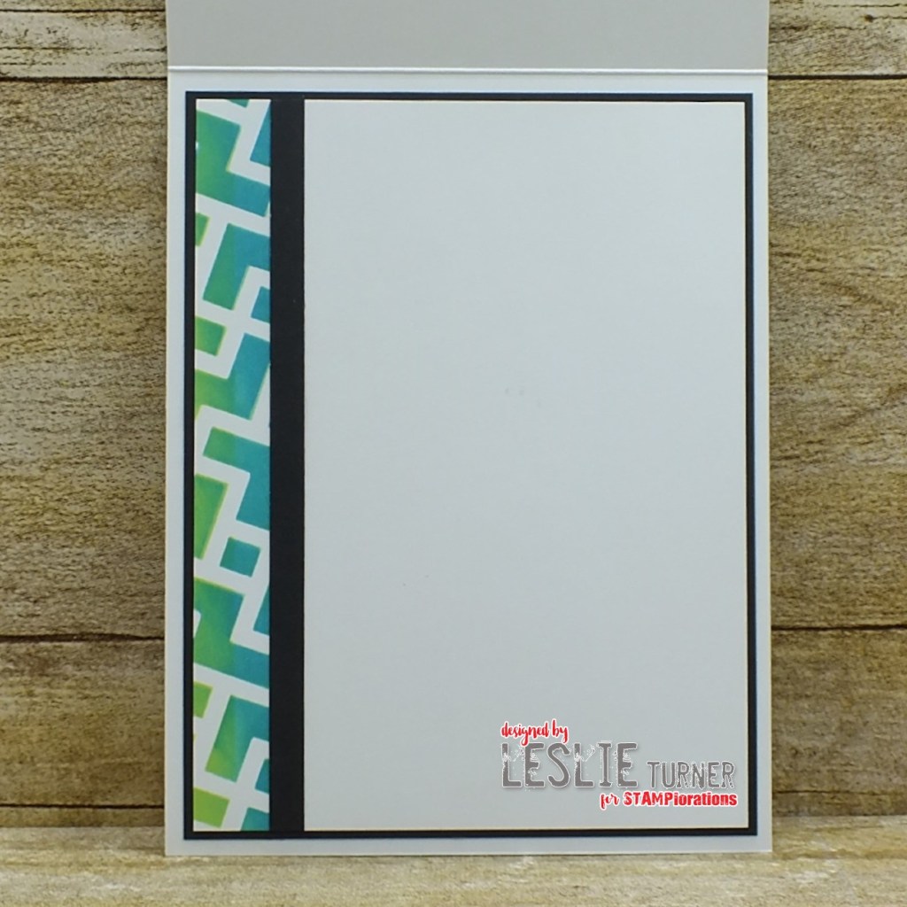 I cut the inside panel from Neenah Classic Crest 80# Solar White cardstock and embellished it with a leftover strip trimmed from the inked panel on the front and a narrow strip of CutCardStock Pop-Tone Black Licorice, and layered the panel on the black cardstock. Since this is a note card, I left the panel blank to write a custom message.